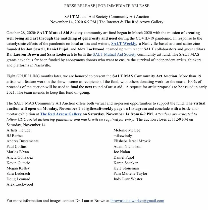 Recipients will be encouraged to contribute work to a collective group art show . Work sold at the show will financially contribute to growing the MAS SALT Fund for our next set of needs as a community.